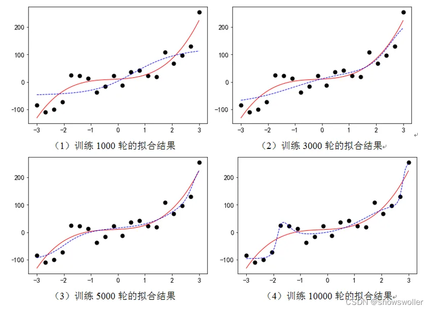 随着训练轮数的增加,拟合结果也从欠拟合变成过拟合
