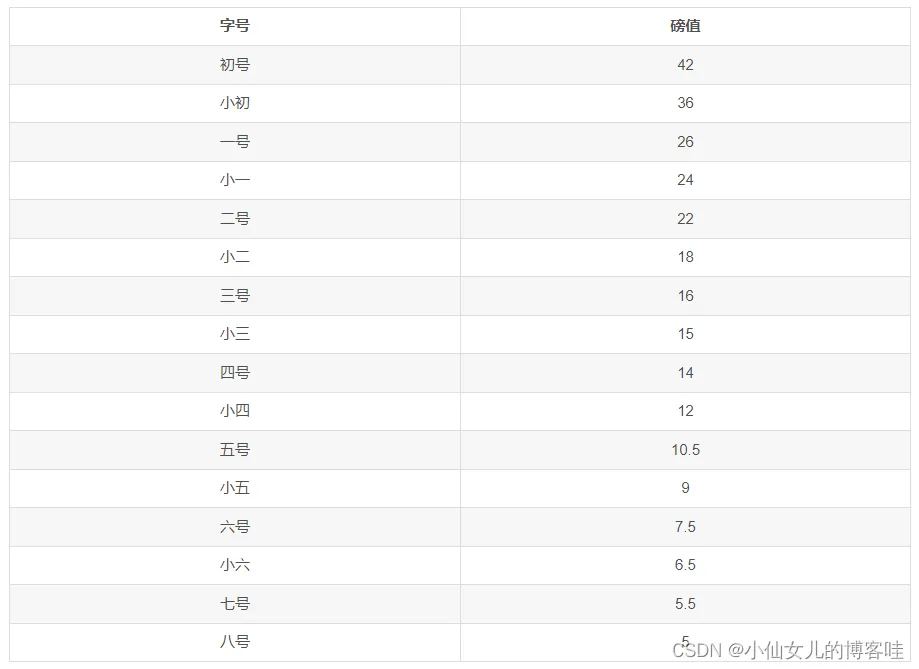 注意,字体大小设置的单位为磅,不是像素,word中字体与磅值对比如下: