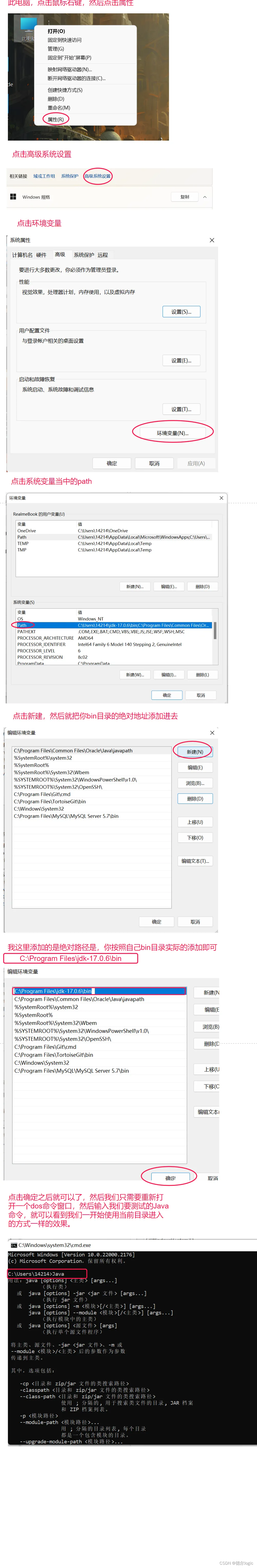 ①我的电脑——>右键——>属性——>高级系统设置——> 环境变量——>找到系统变量中的path,点击进去——>新建——>把bin绝对路径添加进去——>一直点击确定