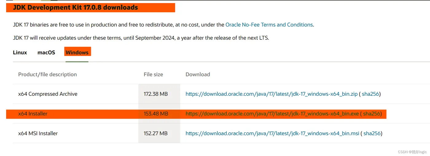 前往Oracle官网下载适合你操作系统的JDK安装包。确保下载的版本是适合你的操作系统和位数(32位或64位)的。我这里使用的是win10,x64的17.0.8版本的JDK。官网地址:https://www.oracle.com/cn/java/technologies/downloads/