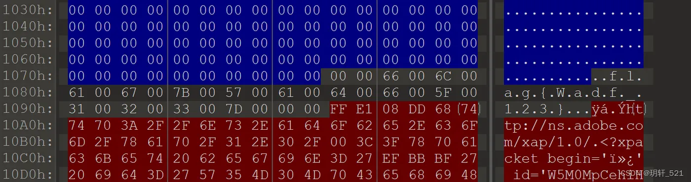 2、使用010 Editor打开图片,查阅数据时,发现flag。(flag中的“W”要注意大写!)
