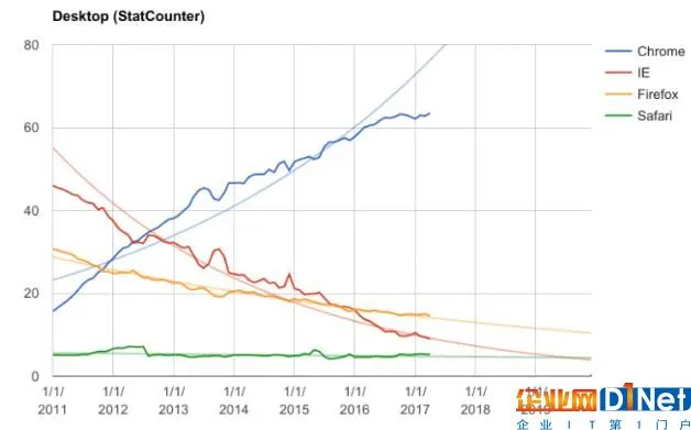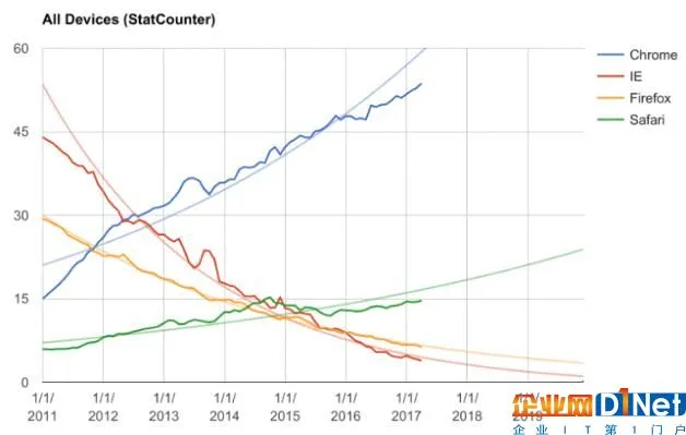 Chrome和Safari的处境也不比IE和火狐好太多。对于Chrome来说,其市场份额已经如此大,增长空间不大了。部分用户仍然在使用不支持Chrome的旧版操作系统。Safari最近的增长,弱于其趋势,最可能的原因是iOS设备增长已经放缓。
