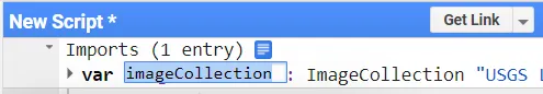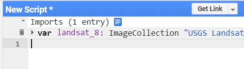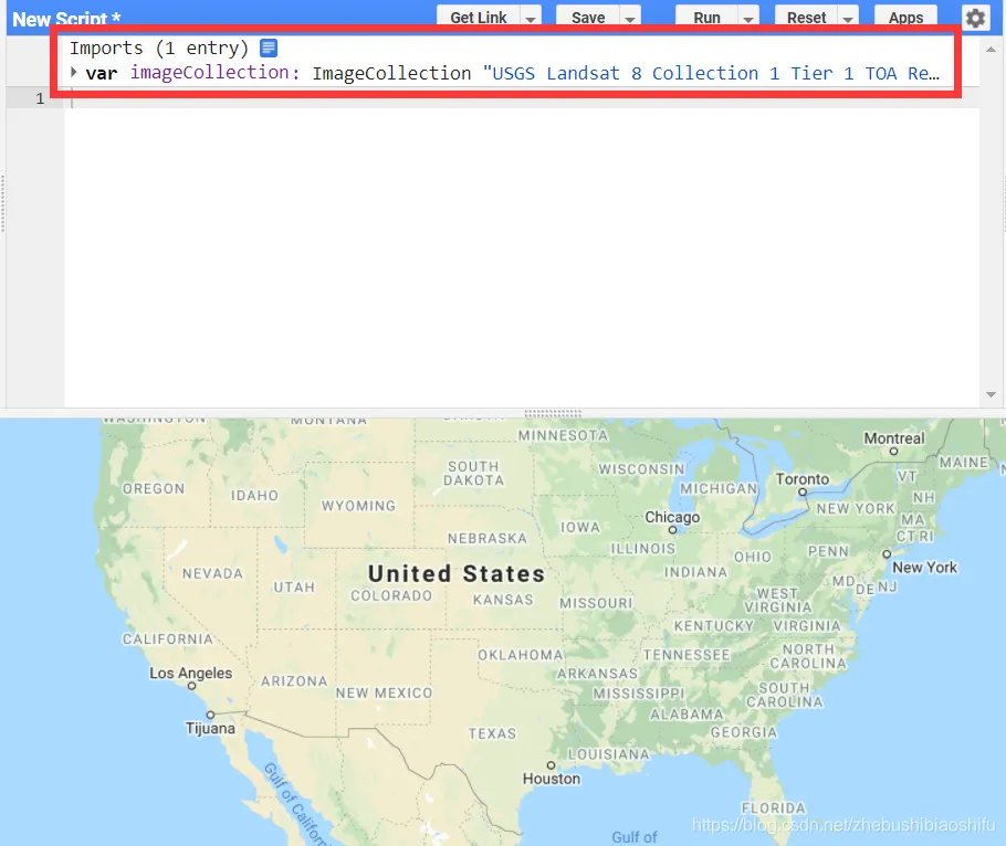 可以看到,在代码界面已经出现了该产品的导入信息。在这里需要注意,导入的Landsat产品是全球所有景、长时间序列的遥感影像组合;即其并不是单独的一张或一层,而是多张、多层的(这里一张指的是一景,一层指的是一个时间点的全部遥感影像)。