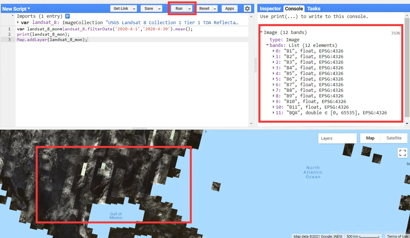 从下图可以看到,按下“Run”运行代码后,可以在“Console”中看到得到的landsat_8_mon信息,同时也可以在地图中看到landsat_8_mon的实际影像。