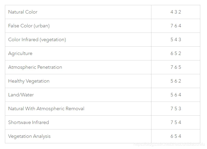 其中,Landsat 8的波段色彩组合方式如下,大家可以依据实际情况加以选择。