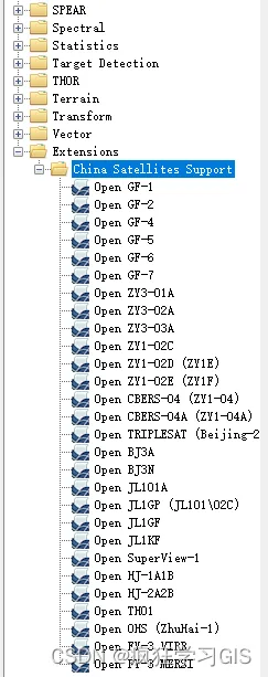 例如,我们刚刚安装了“中国国产卫星支持工具”这一App,那么在重启ENVI软件后,即可在“Toolbox”中的“Extensions”一栏找到这一工具。