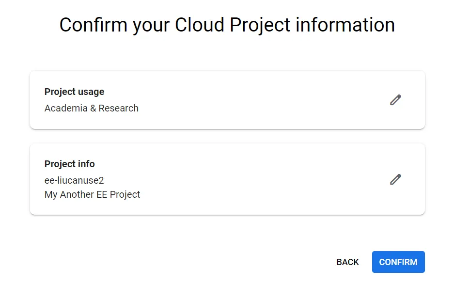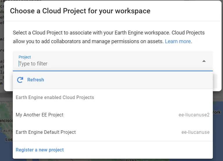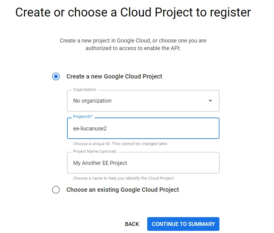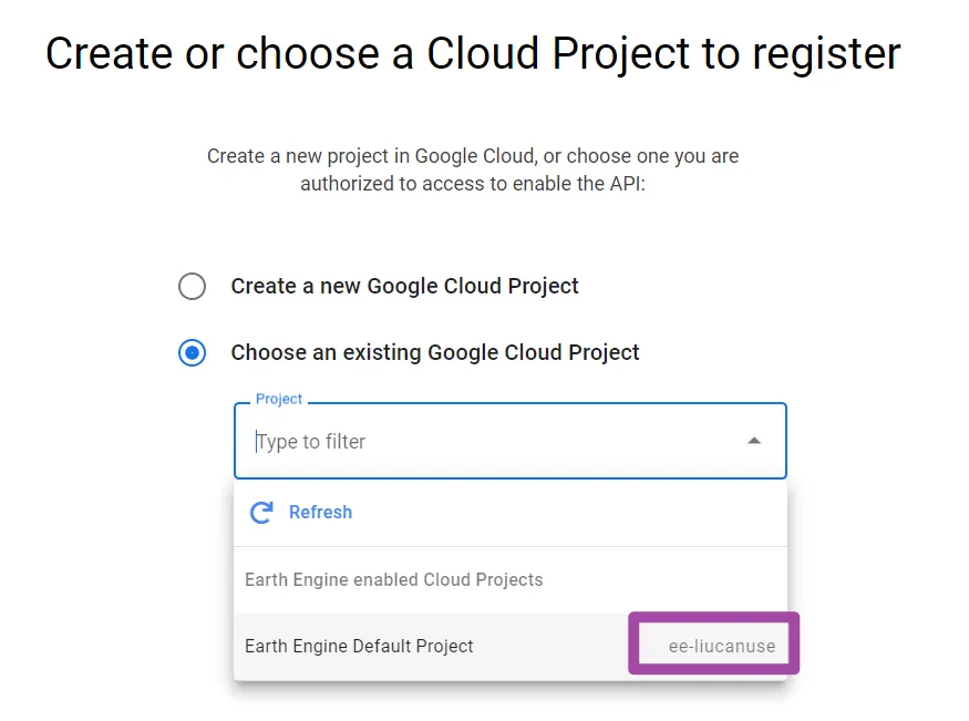 接下来,我们需要选择一下,是用一个新创建的Cloud Project,还是用当前这个Gmail账号原有的Cloud Project,作为我们访问GEE所用的Cloud Project;如下图所示。在我这里,由于原本就用这种方法注册过一个访问GEE所用的Cloud Project,所以就会有如下图所示的界面。