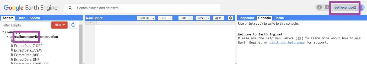 确认无误后,即可进入GEE界面。如下图所示,右上角将显示我们当前的Cloud Project名称,而左侧“Scripts”中,则会显示我们这个Gmail账户所拥有的全部代码脚本。