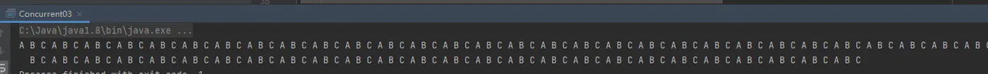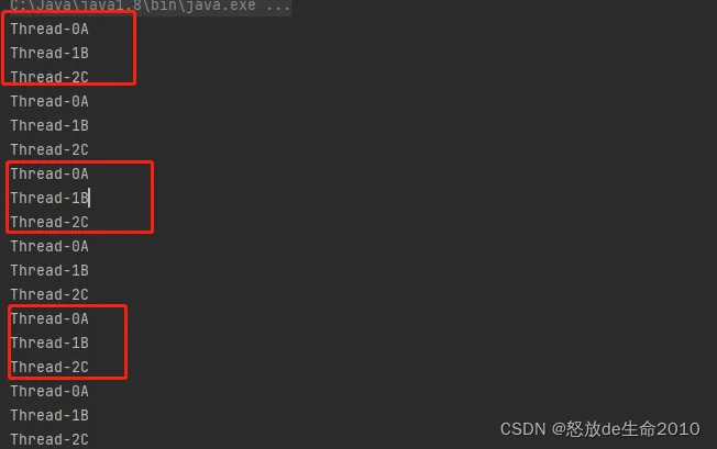 import java.util.concurrent.locks.Lock; import java.util.concurrent.locks.ReentrantLock; public class OrderDemo { private static Lock lock = new ReentrantLock(); private static int state = 0; //线程1 static class ThreadA extends Thread{ @Override public void run(){ for (int i = 0; i < 10; ) { lock.lock(); try { if (state % 3 == 0){ System.out.println(Thread.currentThread().getName() + "A"); state++; i++; } }finally { lock.unlock(); } } } } //线程2 static class ThreadB extends Thread{ @Override public void run(){ for (int i = 0; i < 10; ) { lock.lock(); try { if (state % 3 == 1){ System.out.println(Thread.currentThread().getName() + "B"); state++; i++; } }finally { lock.unlock(); } } } } //线程3 static class ThreadC extends Thread{ @Override public void run(){ for (int i = 0; i < 10; ) { lock.lock(); try { if (state % 3 == 2){ System.out.println(Thread.currentThread().getName() + "C"); state++; i++; } }finally { lock.unlock(); } } } } public static void main(String[] args) { new ThreadA().start(); new ThreadB().start(); new ThreadC().start(); } }