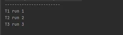 public class JoinDemo { //main方法测试 public static void main(String[] args) { //线程1 final Thread t1 = new Thread(new Runnable() { @Override public void run() { System.out.println(Thread.currentThread().getName() + " run 1"); } }, "T1"); //线程2 final Thread t2 = new Thread(new Runnable() { @Override public void run() { try { //t1想插队,t1执行完,t2才能执行 t1.join(); System.out.println(Thread.currentThread().getName() + " run 2"); } catch (InterruptedException e) { e.printStackTrace(); } } }, "T2"); //线程3 final Thread t3 = new Thread(new Runnable() { @Override public void run() { try { //t2想插队,t2执行完,t3才能执行 t2.join(); System.out.println(Thread.currentThread().getName() + " run 3"); } catch (InterruptedException e) { e.printStackTrace(); } } }, "T3"); t1.start(); t2.start(); t3.start(); System.out.println("-----------------------"); } }