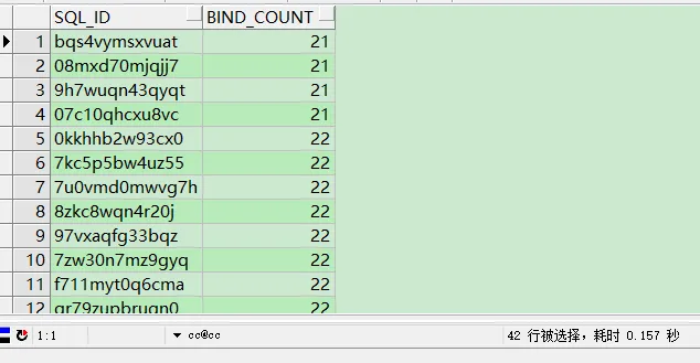 select sql_id, count(*) bind_count from v$sql_bind_capture where child_number = 0 group by sql_id having count(*) > 20 order by count(*);