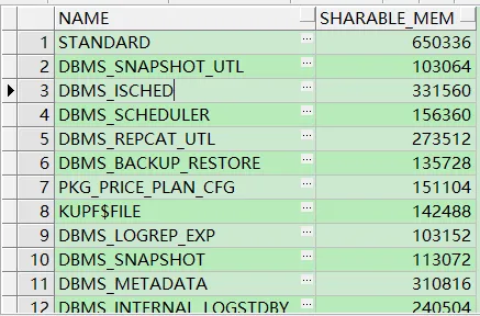 select name, sharable_mem from v$db_object_cache where sharable_mem > 100000 and type in ('PACKAGE', 'PACKAGE BODY', 'FUNCTION', 'PROCEDURE') and kept = 'NO';
