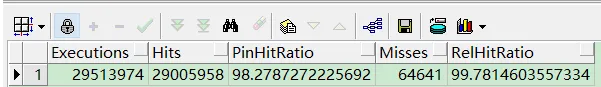 select sum(pins) "Executions", sum(pinhits) "Hits", ((sum(pinhits) / sum(pins)) * 100) "PinHitRatio", sum(reloads) "Misses", ((sum(pins) / (sum(pins) + sum(reloads))) * 100) "RelHitRatio" from v$librarycache;