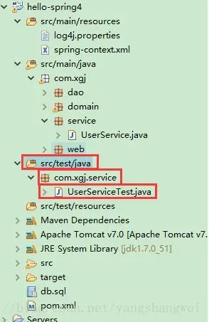 - 因本模块采用Maven构建 ,所以在约定目录下 src\test\java测试目录下创建和UserService一致的包结构,并创建UserService对应的测试类UserServiceTest ,目录如下: