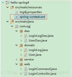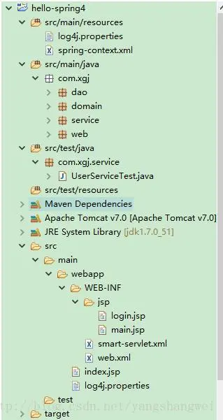 类包以分层的方式进行组织,供划分为dao、domain、service、web。