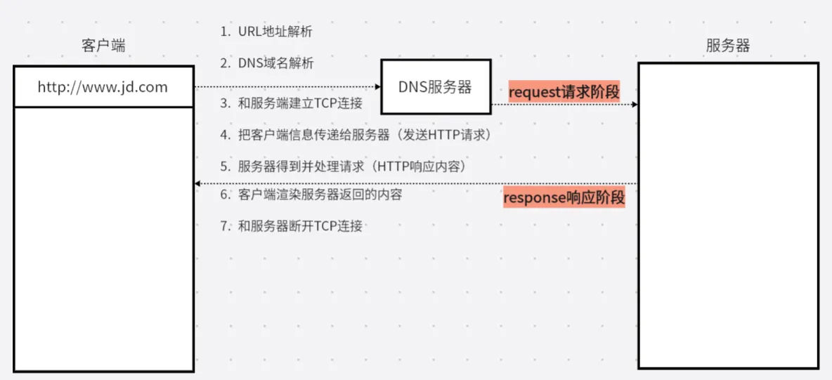 浏览器将用户请求的地址进行解析,解析完成之后,我们想要到达服务器,首先得到达一个叫做DNS服务器,DNS服务器可以通过用户的地址,为用户匹配到应该要连接到的服务器,当找到对应的服务器后,客户端就与服务器建立一个TCP连接,连接建立起来后,就可以通过HTTP将客户端要给服务器的内容传给它,服务器接收到请求后,服务器就进行处理,将处理后的结果也通过HTTP返回可客户端,客户端就将拿到的数据进行渲染。这样本次请求和服务器响应就已经完成了,然后将之前建立的TCP连接断掉。