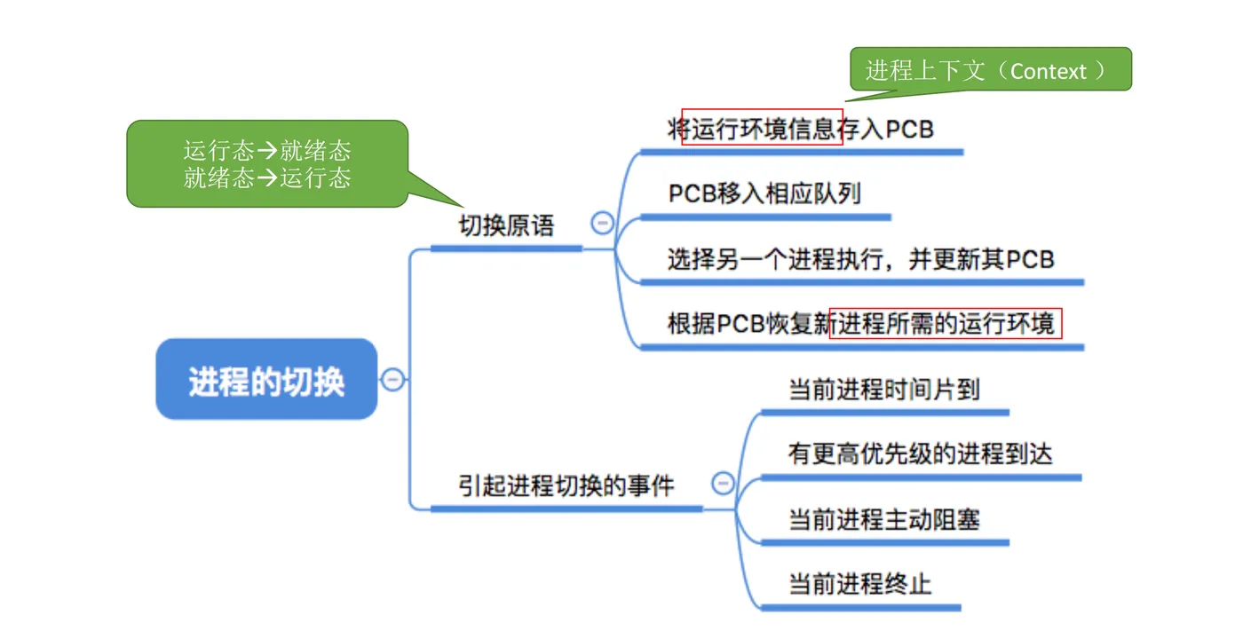 终止态(结束态):进程正在从系统中撤销,操作系统回收进程的资源、撤销PCB