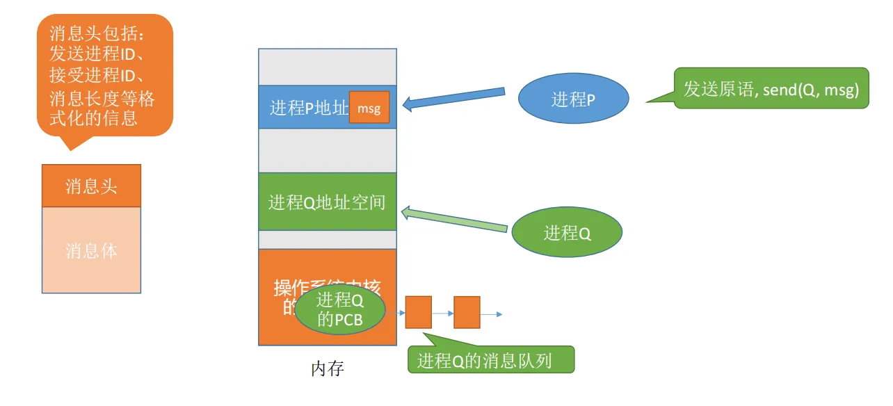 进程间的数据交换以格式化的消(Message)为单位。进程通过操作系统提供的“发送消息/接收消息”两个原语进行数据交换。