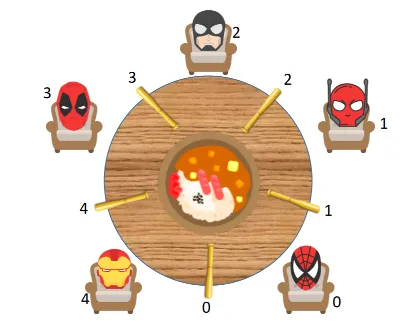 - 仅当一个哲学家左右两支筷子都可用时才允许他抓起筷子。