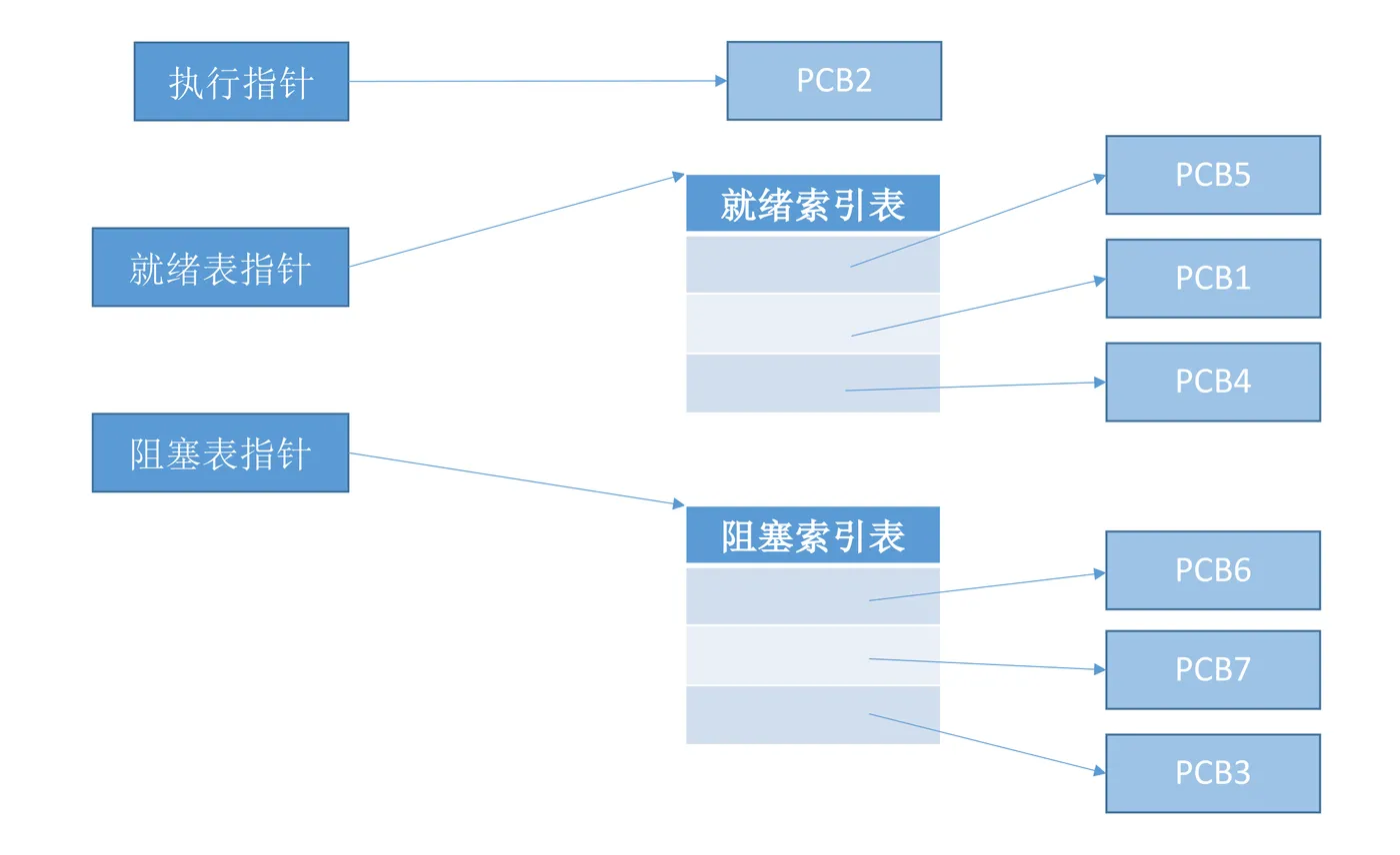 阻塞队列指针:指向当前处于阻塞态的进程(很多操作系统还会根据阻塞原因不同,再分为多个阻塞队列)