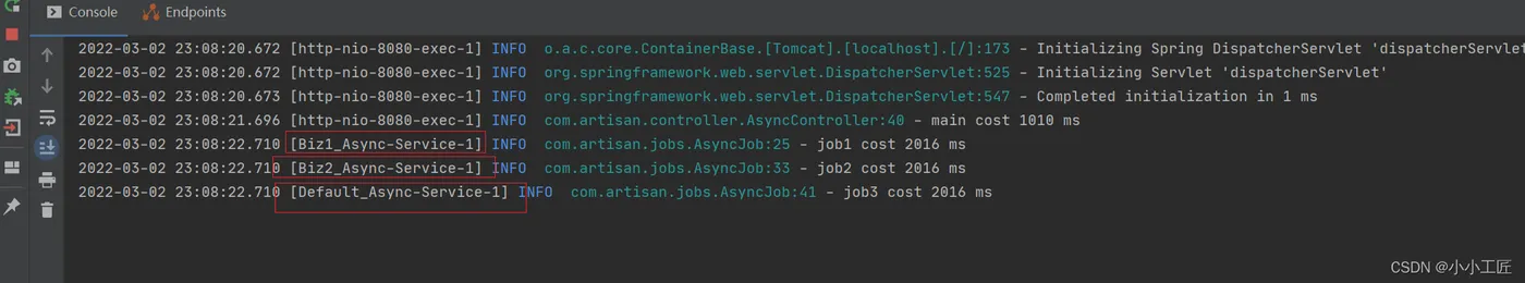 @RestController @RequestMapping("/async") @Slf4j public class AsyncController { @Autowired private AsyncJob asyncJob; @RequestMapping("/job") public String task() throws InterruptedException { long beginTime = System.currentTimeMillis(); // 执行异步任务 asyncJob.job1(); asyncJob.job2(); asyncJob.job3(); // 模拟业务耗时 Thread.sleep(1000); long cost = System.currentTimeMillis() - beginTime; log.info("main cost {} ms", cost); return "Task Cost " + cost + " ms"; }