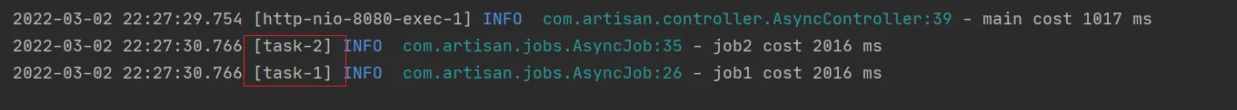 2022-03-02 22:33:47.007 [http-nio-8080-exec-6] INFO com.artisan.controller.AsyncController:39 - main cost 1001 ms 2022-03-02 22:33:47.675 [http-nio-8080-exec-2] INFO com.artisan.controller.AsyncController:39 - main cost 1001 ms 2022-03-02 22:33:48.021 [task-4] INFO com.artisan.jobs.AsyncJob:35 - job2 cost 2014 ms 2022-03-02 22:33:48.021 [task-3] INFO com.artisan.jobs.AsyncJob:26 - job1 cost 2014 ms 2022-03-02 22:33:48.396 [http-nio-8080-exec-5] INFO com.artisan.controller.AsyncController:39 - main cost 1015 ms 2022-03-02 22:33:48.678 [task-6] INFO com.artisan.jobs.AsyncJob:35 - job2 cost 2004 ms 2022-03-02 22:33:48.678 [task-5] INFO com.artisan.jobs.AsyncJob:26 - job1 cost 2004 ms 2022-03-02 22:33:49.004 [http-nio-8080-exec-3] INFO com.artisan.controller.AsyncController:39 - main cost 1008 ms 2022-03-02 22:33:49.393 [task-8] INFO com.artisan.jobs.AsyncJob:35 - job2 cost 2011 ms 2022-03-02 22:33:49.393 [task-7] INFO com.artisan.jobs.AsyncJob:26 - job1 cost 2011 ms 2022-03-02 22:33:50.012 [task-9] INFO com.artisan.jobs.AsyncJob:26 - job1 cost 2015 ms 2022-03-02 22:33:50.012 [task-10] INFO com.artisan.jobs.AsyncJob:35 - job2 cost 2015 ms