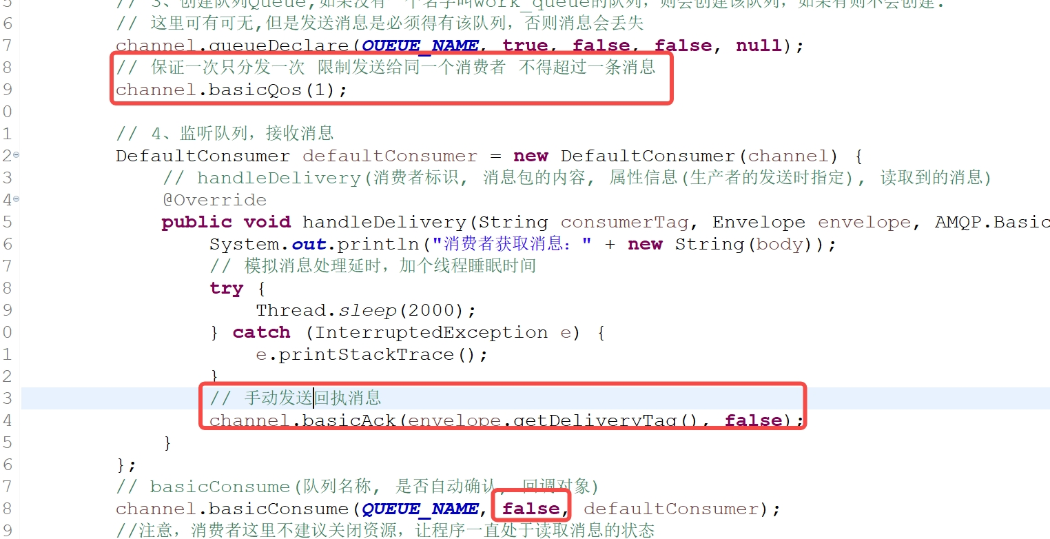 2. 消费者:关闭自动确认,并且手动发送ACK给队列