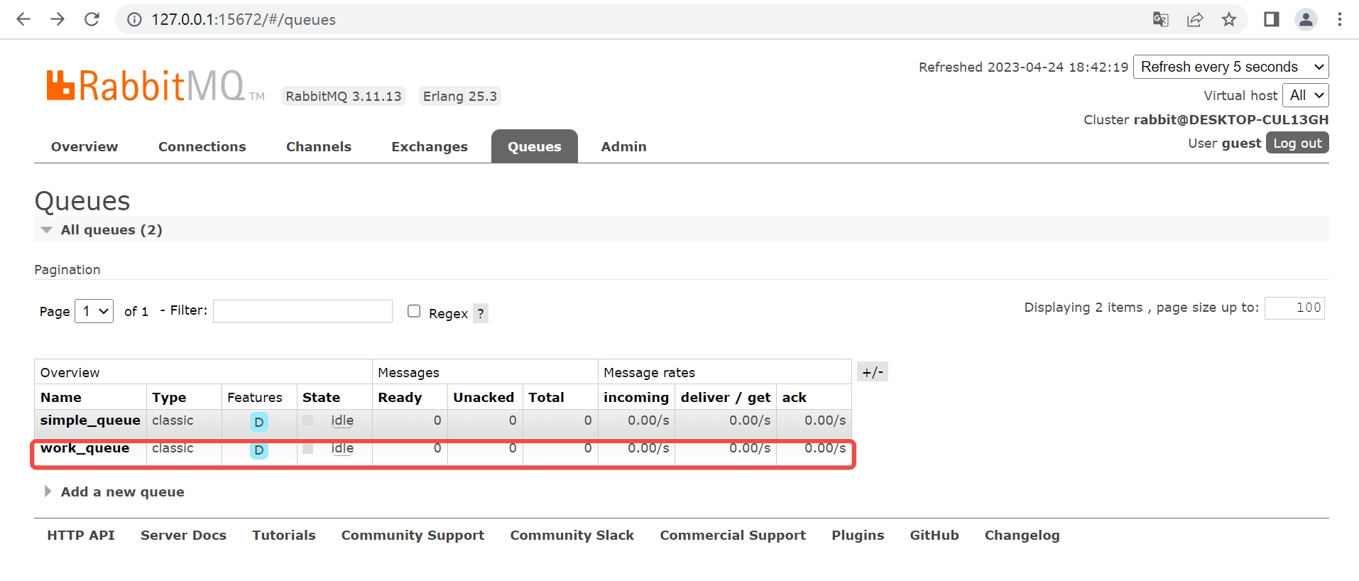 从RabbitMQ管理后台查看,已经创建了`work_queue`队列。