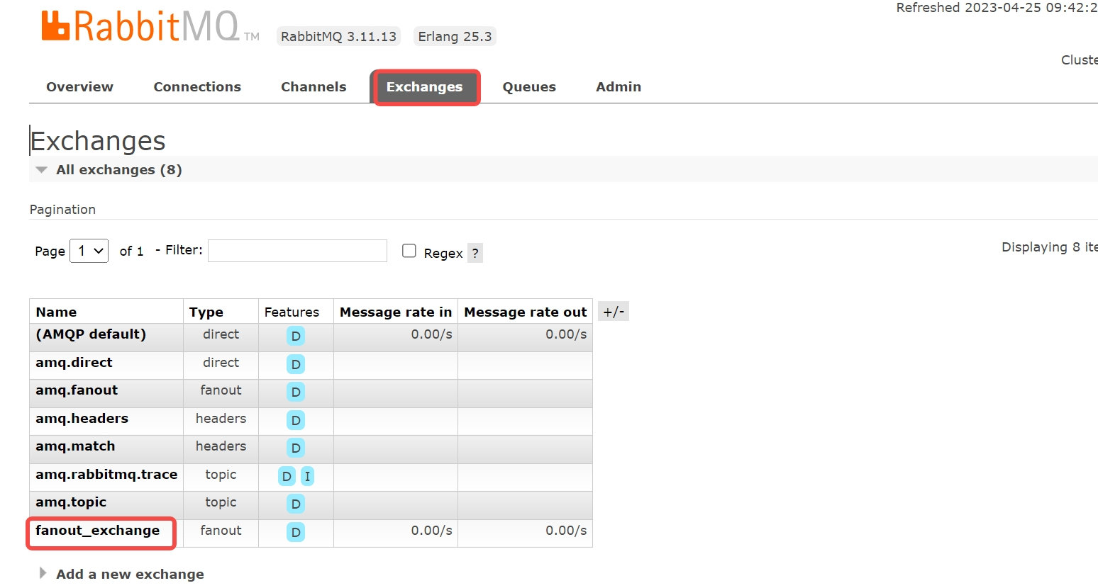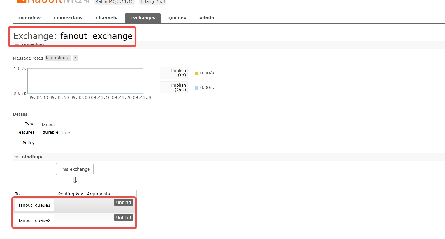 执行完测试代码后,在RabbitMQ的管理后台找到Exchanges选项卡,点击`fanout_exchange`交换机,可以查看到如下的绑定: