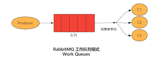 工作模式也被称为任务模型(Task Queues)。当消息处理比较耗时的时候,可能生产消息的速度会远远大于消息的消费速度。长此以往,消息就会堆积越来越多,无法及时处理。此时就可以使用 work 模型:让多个消费者绑定到一个队列,共同消费队列中的消息。队列中的消息一旦消费,就会消失,因此任务是不会被重复执行。