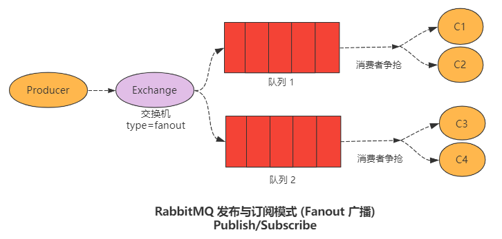 发布订阅模式(Publish/Subscribe):该模式需要涉及到交换机了,也可以称它为广播模式,消息通过交换机广播到所有与其绑定的队列中。