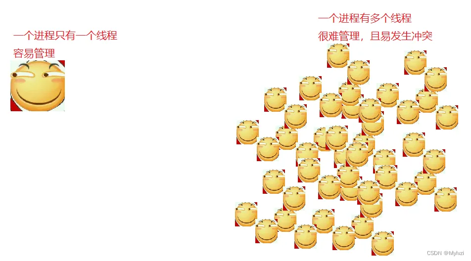既然线程能够提升效率,那么我们只要在一个进程内部尽可能多的创建新的线程,那效率不就会越来越高么?实际上,任何事情都不能过度,线程数目过多,效率会不增反降。进程也是需要去管理的线程的,当线程数量较少时,管理起来很容易,也能够提高效率,但如果线程的数量越来越多,就变得难以管理了,进程管理的难度就会增加,且更加容易出错(管理3人团队远没有管理100人难),线程与线程之间可能会发生矛盾