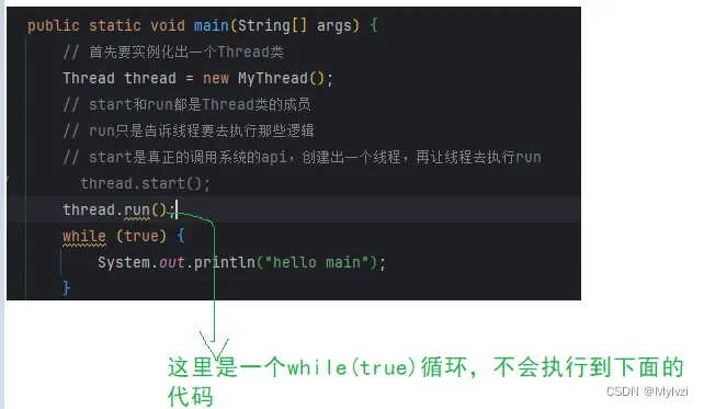 如果都是用while(true)循环,而不使用start方法,打印结果是什么呢?只会执行hello Thread,原因在于如果使用run方法并不会将"hello Thread"看作一个线程,可以理解为就是一个简单的方法调用,只有当调用的方法执行完毕之后会执行main方法中剩余的代码,而这个方法调用反而是死循环的,所以"hello main" 根本不会打印,这就是一个简单的方法调用,是存在先后顺序的,而多线程解决的是"并发编程",是同时执行