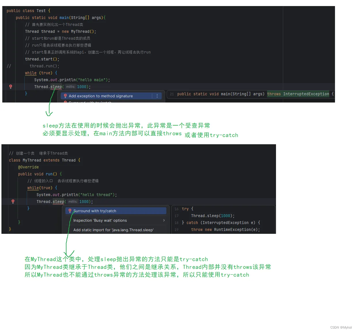 2.sleep方法在使用的过程中会抛出异常,不同的位置处理异常的方式会有所差异