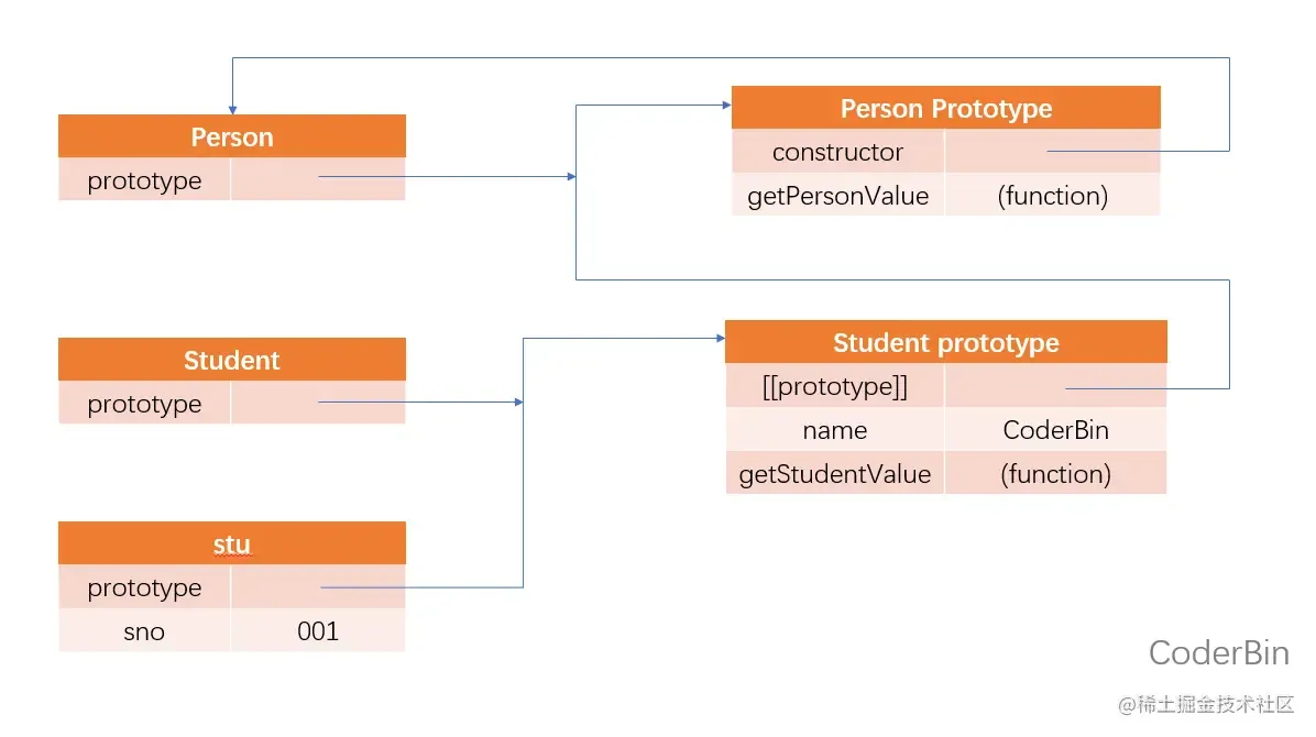 // 定义 Person 构造函数 function Person() { this.name = 'CoderBin' } // 给 Person 的原型上添加 getPersonValue 方法(原型方法) Person.prototype.getPersonValue = function() { return this.name } // 定义 Student 构造函数 function Student() { this.sno = '001' } // 继承 Person — 将 Peson 的实例赋值给 Student 的原型 Student.prototype = new Person() Student.prototype.getStudentValue = function() { return this.sno } // 实例化 Student let stu = new Student() console.log(stu.getPersonValue()) // CoderBin