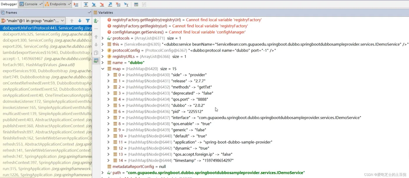 <dubbo:service beanName="ServiceBean:com.gupaoedu.springboot.dubbo.springbootdubbosampleprovider.services.IDemoService" /> <dubbo:service beanName="ServiceBean:com.gupaoedu.springboot.dubbo.ISayHelloService" /> dubbo://ip:port?com.gupaoedu.springboot.dubbo.springbootdubbosampleprovider.services.IDemoService&xxx&xxx dubbo://ip:port?com.gupaoedu.springboot.dubbo.ISayHelloService&xxx&xxx