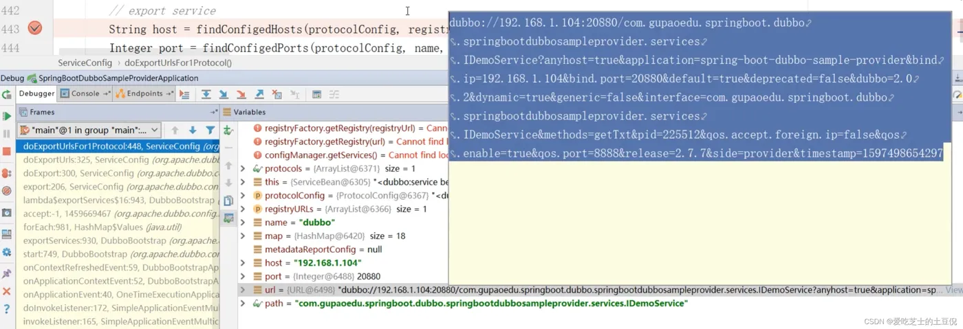 // export service // 最终获取到 host的地址 以及 端口号 String host = findConfigedHosts(protocolConfig, registryURLs, map); Integer port = findConfigedPorts(protocolConfig, name, map); // 然后就是组装url了 URL url = new URL(name, host, port, getContextPath(protocolConfig).map(p -> p + "/" + path).orElse(path), map);