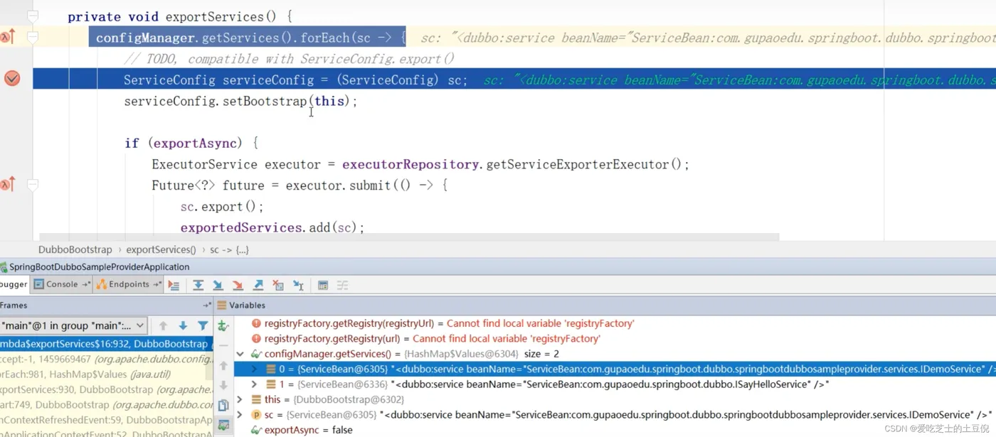 private void exportServices() { // 这里面有我们要发布服务的列表 configManager.getServices().forEach(sc -> { // TODO, compatible with ServiceConfig.export() ServiceConfig serviceConfig = (ServiceConfig) sc; serviceConfig.setBootstrap(this); // 是否异步发布还是同步发布 if (exportAsync) { // 使用线程池来异步发布 ExecutorService executor = executorRepository.getServiceExporterExecutor(); Future<?> future = executor.submit(() -> { sc.export(); exportedServices.add(sc); }); asyncExportingFutures.add(future); } else { sc.export(); exportedServices.add(sc); } }); }