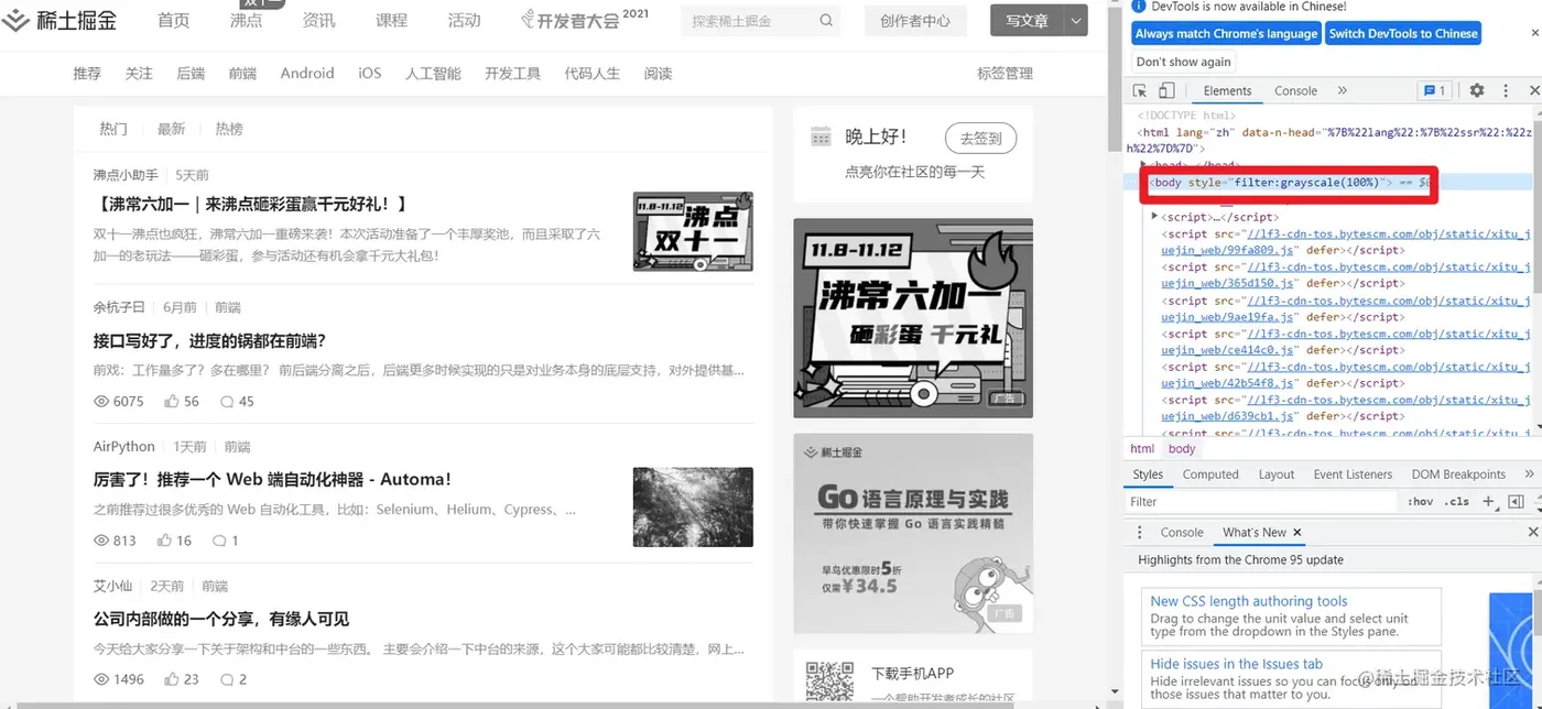 只需要将这一行代码filter:grayscale(100%)放到body上,一下就能致黑