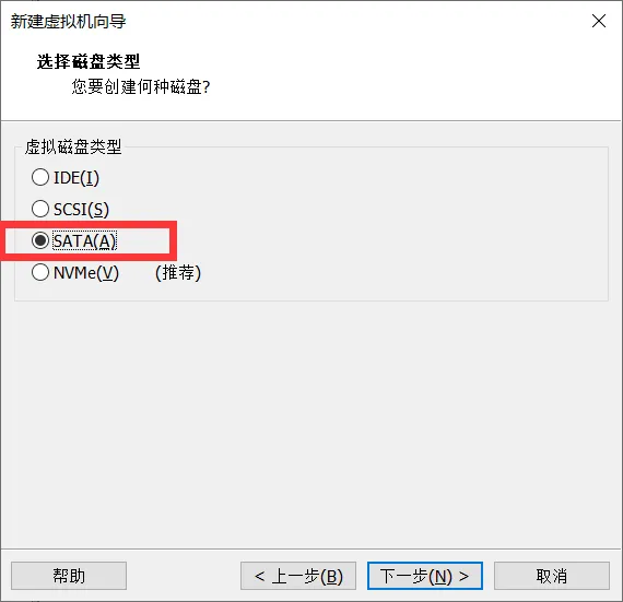 这里划重点,如果磁盘类型选错会导致后面出现无法识别到分配的磁盘的情况!根据实际选择,不知道就选SATA,选错了也没关系,回来教你怎么改。