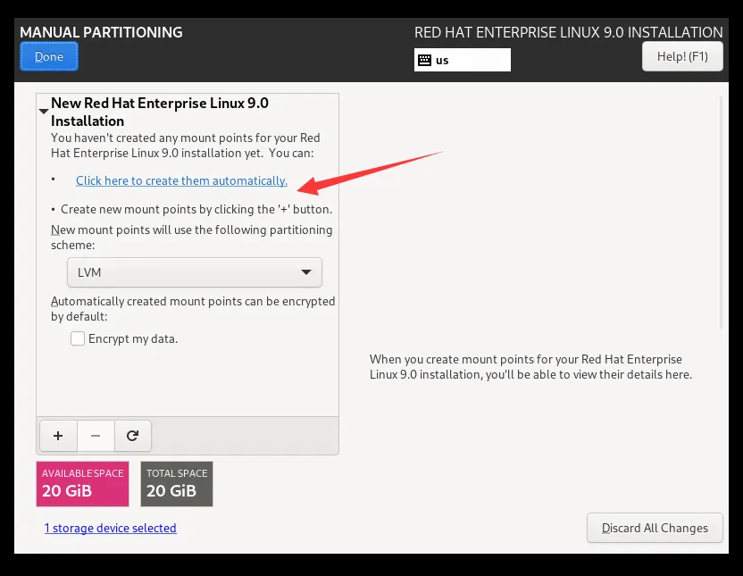 根据需要我们来划分磁盘,选择scheme为 LVM 后,点击 Click here to create them automatically,会自动生成初始分区。