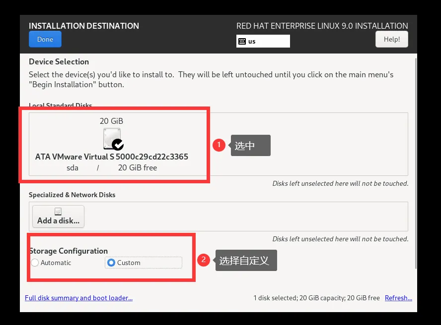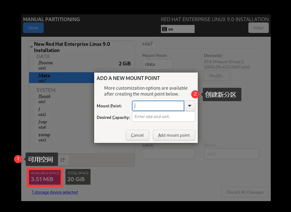 这里有些同学会出现找不到磁盘的情况,可以参考我之前的文章:VMware安装RHEL找不到磁盘,里面有详细解答。