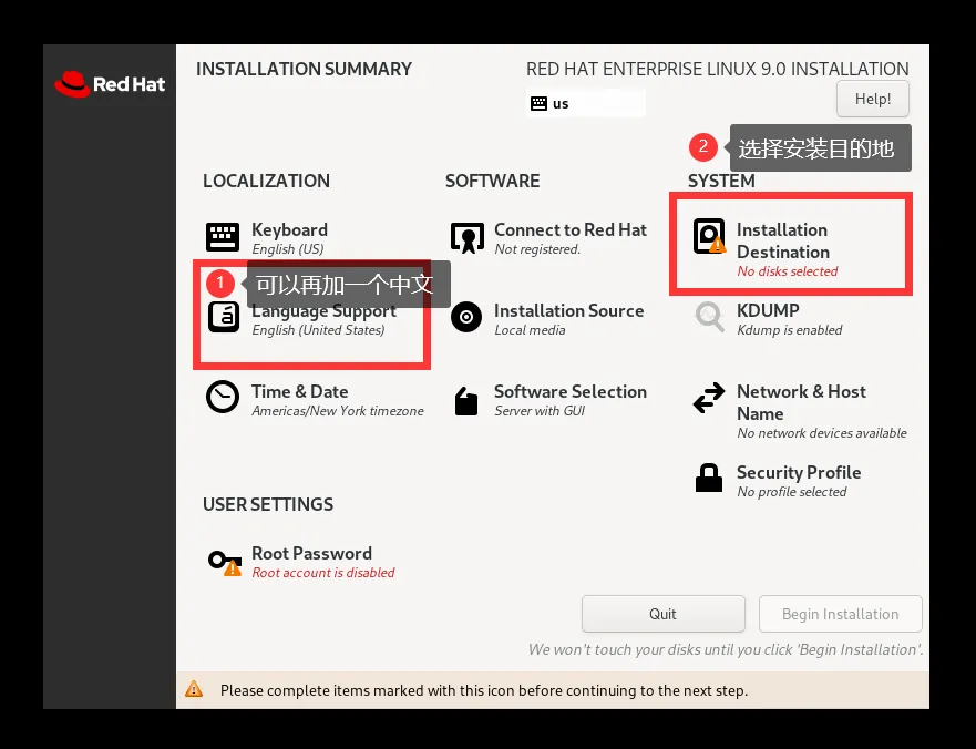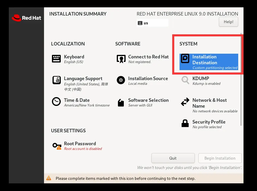 添加中文作为支持语言后,选择Installation Destination(安装目的地)。