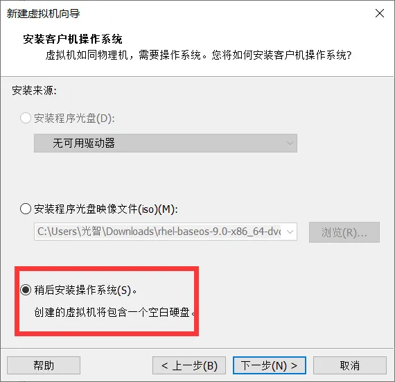 选择稍后安装操作系统。选择客户机操作系统为Linux,版本为需要安装的系统的版本,因为我安装的 Red Hat Enterprise Linux 9.0,所以选择版本为 Red Hat Linux。