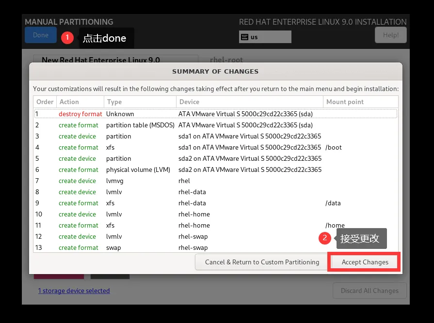 分配磁盘完成点击done,弹窗点击Accept Changes(接受修改)。