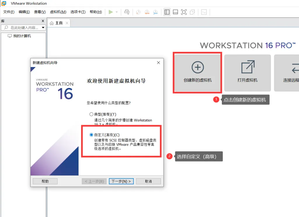 点击[创建新的虚拟机],选择自定义(高级),点击下一步。
