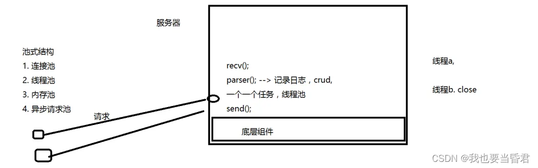 我们对服务器的一些业务需要计算,需要一些计算结果,计算结果计算的时间周期比较长的时候,我们也可以引入另外的线程,反正说我们在开线程的过程中间都可以想到线程池,第三个就是crud,不光是在服务器上面