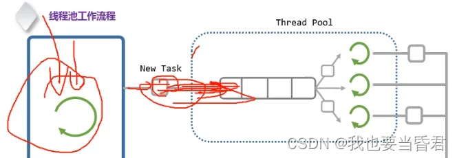 然后这一系列的线程就组成了一个集合,这个集合,就变成了一个执行队列,那这个执行队列执行什么东西呢,就从任务队列里面取任务,并且进行执行
