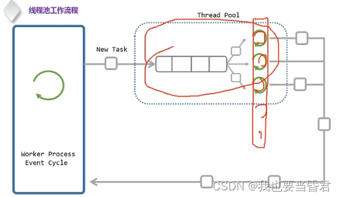 这里面这个绿色的就相当于线程的入口函数,它是不断的去任务队列里面取任务执行,不断就是循环,取完任务之后,执行的时候就是执行回调函数