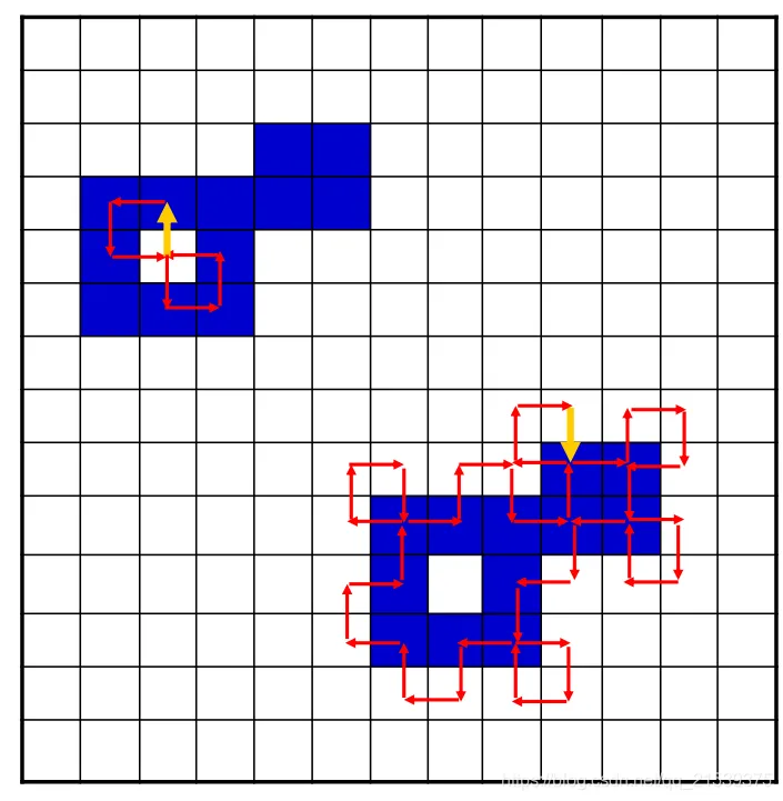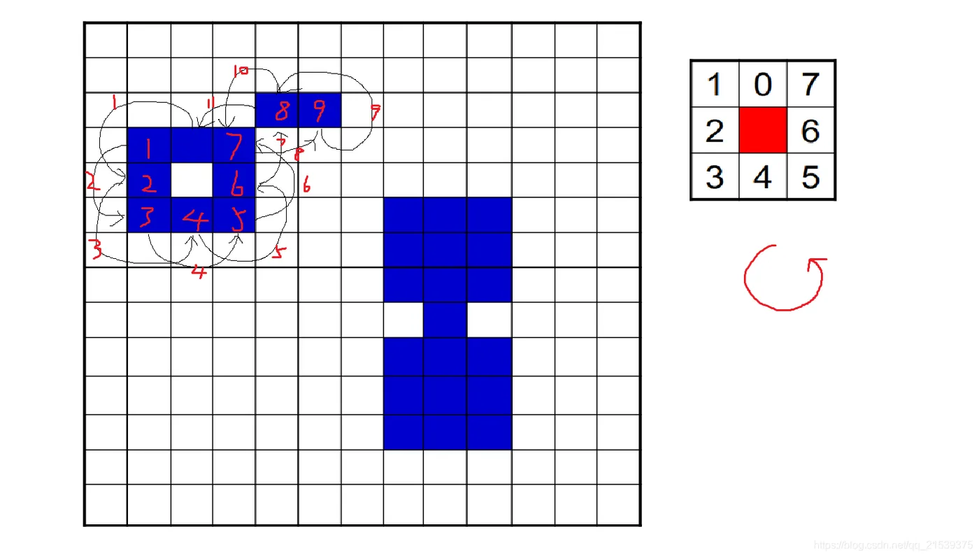 先从1的蓝色像素块开始,以该像素块为中心,按照曲线1,指向像素块2,接着以像素块2为中心,按照曲线2,指向像素块3…重复该过程,直到回到起点。
